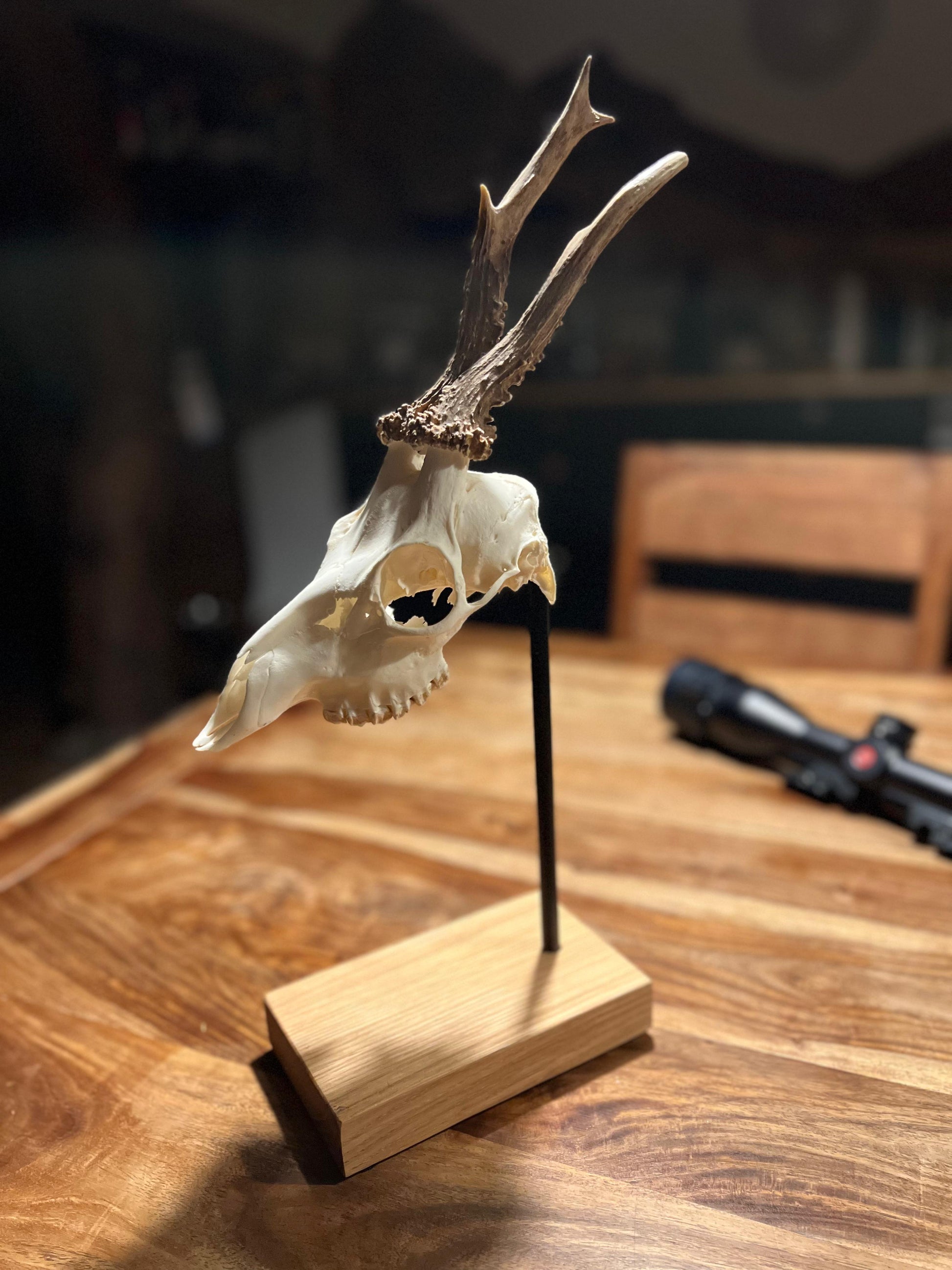 Hochwertiger Trophäenständer aus Holz für Rehwild. Auch für Gams und andere Wildarten mit vergleichbarer Schädelgröße geeignet. In Eiche oder Zirbe. Schonend & stilvoll präsentieren.